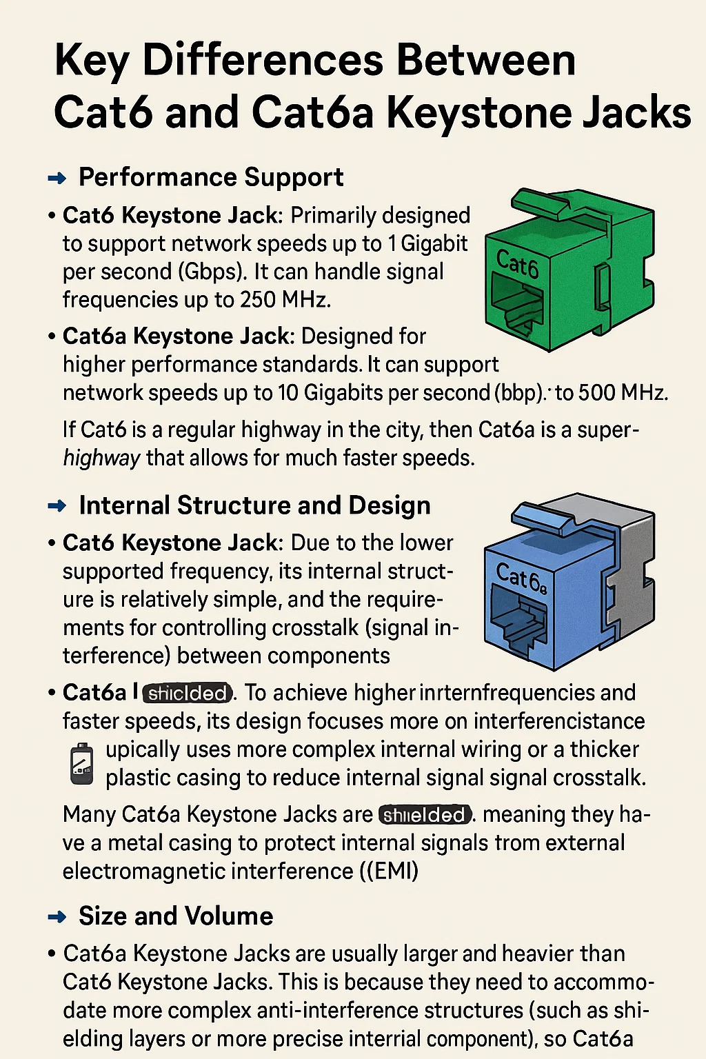 • تكون مقابس Cat6a Keystone عادةً **أكبر وأثقل** من مقابس Cat6 Keystone.