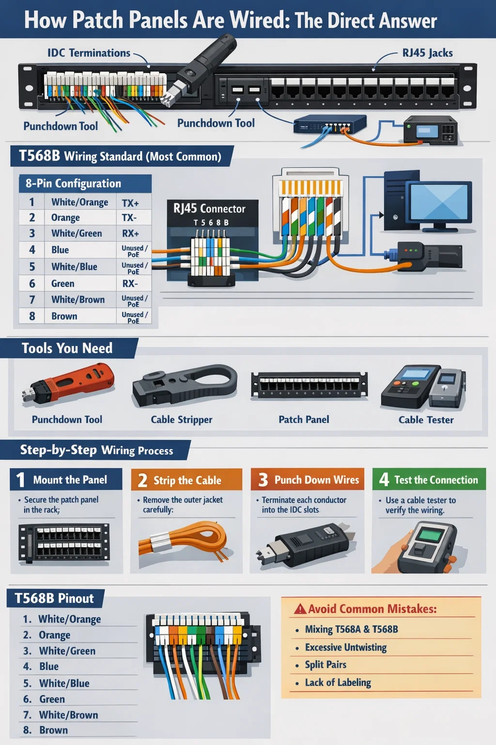 أ patch panel itself does not perform any switching or routing. It is purely a passive termination and cross-connect point. Understanding how it sits in the network path clarifies why proper wiring matters so much.