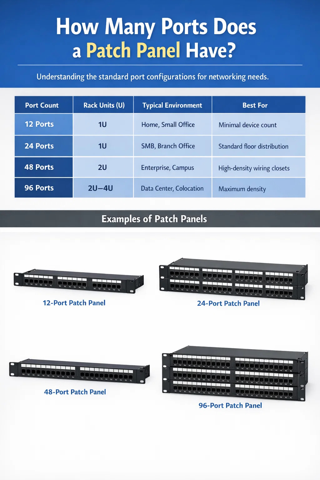 لا يعد عدد المنافذ عشوائيًا - فهو يحدد بشكل مباشر عدد أجهزة الشبكة التي يمكنك إنهاؤها وإدارتها من لوحة واحدة. يؤدي اختيار عدد المنافذ الخاطئ إلى إهدار مساحة الحامل أو انتشار الكابلات الفوضوي الذي يصبح كابوسًا للصيانة بمرور الوقت. إن فهم التكوينات المتاحة هو الخطوة الأولى نحو بنية أساسية لشبكة نظيفة وقابلة للتطوير.