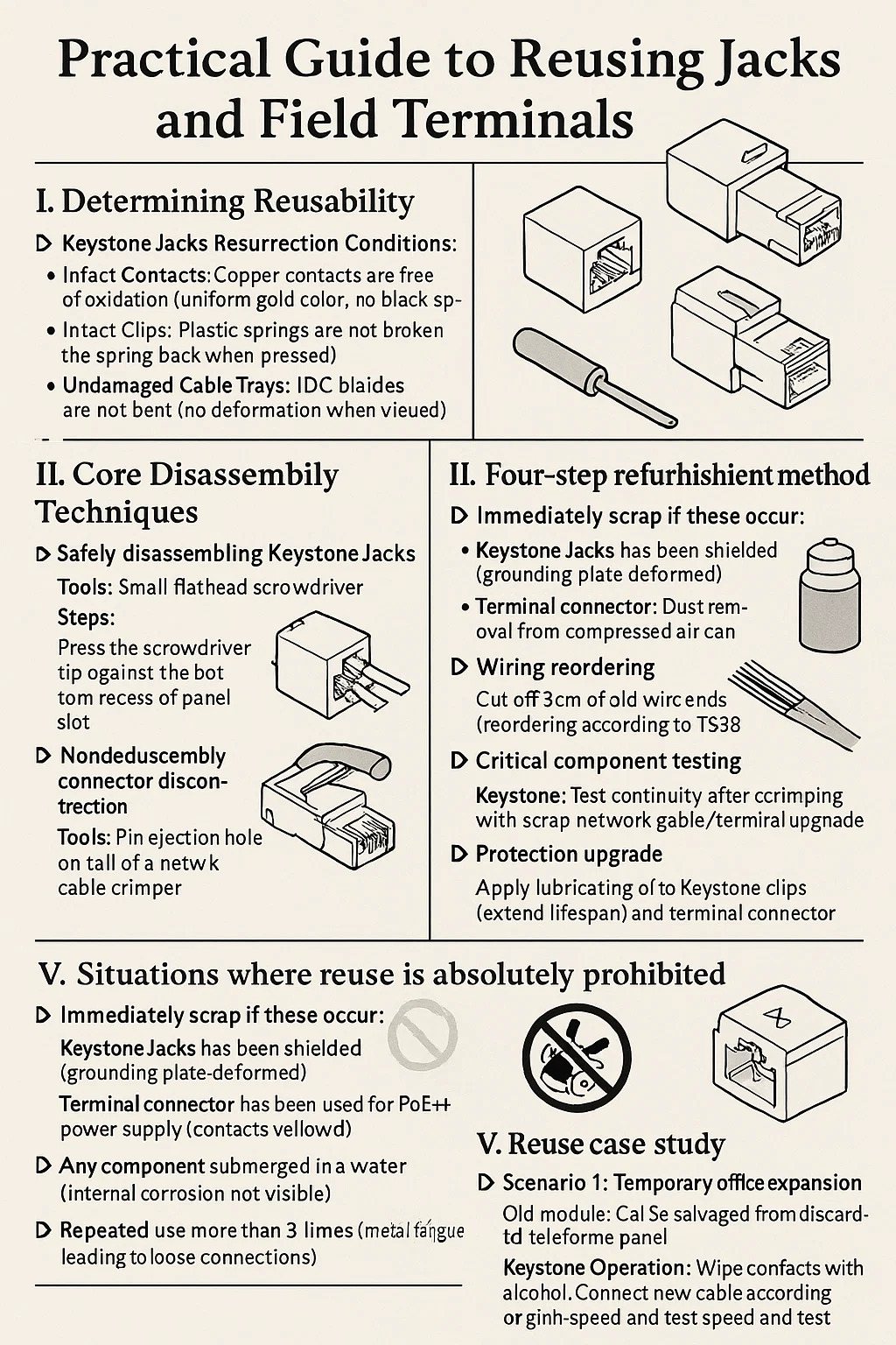 الوحدة القديمة: تم إنقاذ Cat5e من لوحة الهاتف المهملة. عملية Keystone: امسح جهات الاتصال بالكحول. قم بتوصيل الكابل الجديد وفقًا لرمز اللون الأصلي. الاتصال بالمفتاح واختبار السرعة؛ إذا كان يلبي المتطلبات، فهو جاهز للاستخدام.