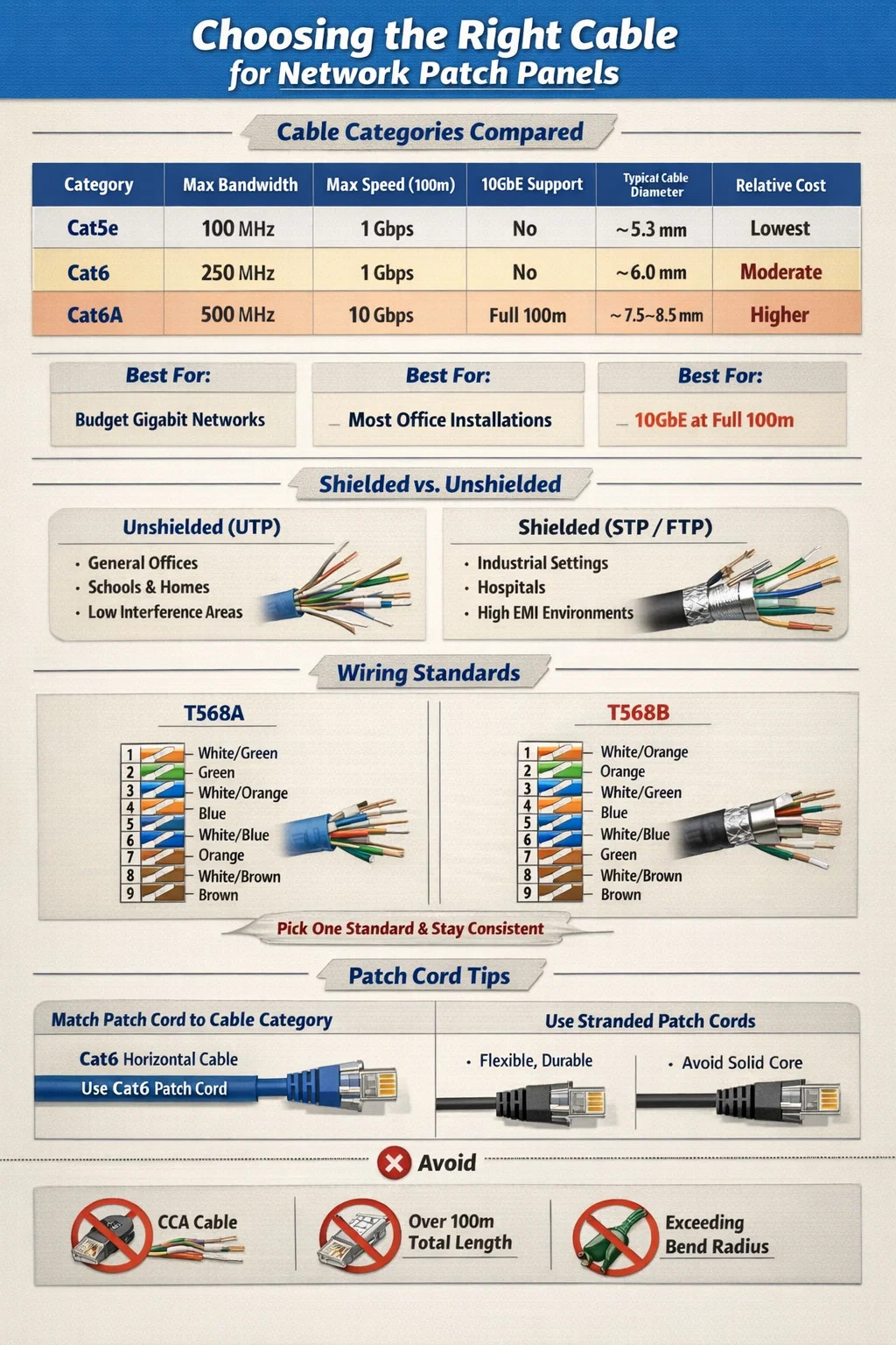 المقايضة هي الحجم المادي والوزن. تعد كابلات Cat6A أكثر سمكًا إلى حد كبير - يبلغ قطرها عادةً من 7.5 إلى 8.5 مم مقابل 6 مم لـ Cat6 - مما يعني حسابات أكثر إحكامًا لملء القناة، وصواني كبلات أثقل، وإدارة نصف قطر الانحناء الأكثر تطلبًا. تعد لوحات التصحيح Cat6A أيضًا أكبر حجمًا وأكثر تكلفة. ومع ذلك، في مراكز البيانات، أو مرافق الرعاية الصحية، أو أي بيئة تنشر 10 جيجابت إيثرنت على سطح المكتب أو المحولات الطرفية، فإن Cat6A هو الاختيار الصحيح وتم تحديده بشكل صريح في TIA-568-C.2 لتطبيقات 10GBASE-T.